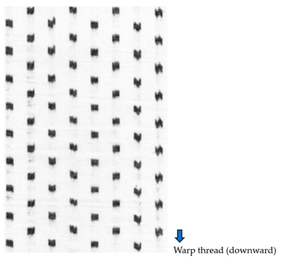 Figure 1 shows a typical Kurume Kasuri pattern, consisting of 900 warp threads (there are two types of weaving threads, warp and weft threads). During the weaving process, variations in the tension of these vertical threads can lead to the creation of unique faded patterns, contributing to the fabric’s charm. However, if the tension variations exceed a certain limit, the resulting irregularities in the faded patterns can render the fabric unsellable, as they fall outside the acceptable range. The tension of the warp threads on the loom or weaving machine is defined as the downward direction as shown in Figure 1.