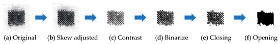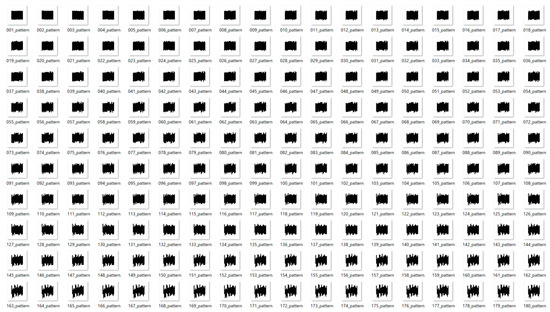 As a result, the pattern width was determined to be 48 pixels, the height 36 pixels, and the thread thickness 3 pixels. Although the mode of the number of black pixels per row obtained in step (6) was 47 pixels, we opted for 48 pixels because it was the second most frequent value, and it aligned with the 16-thread structure. Based on this information, we generated simulation data by adding a discrete uniform random number (0 or 1) to the starting position of the pattern, causing the deviation to gradually increase. A total of 500 simulated patterns were created (Figure 6). Note that the seed value for random number generation was not specified.