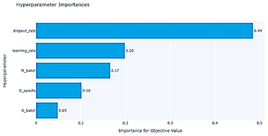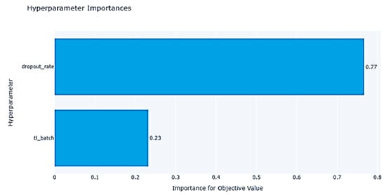 In both the case of transfer learning only and the case of performing fine-tuning after transfer learning, the dropout rate was the most important hyperparameter, while the other hyperparameters had categorical search ranges. This importance is likely due to the dropout rate’s continuous and wide search range. The irregular accuracy changes observed when only the dropout rate was adjusted can be attributed to the random nature of dropout, which may occasionally remove nodes with significant features for classification. To measure accuracy more reliably, K-fold cross-validation is necessary.