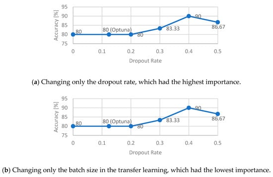 Figure 9a illustrates the change in accuracy when only the highly important dropout rate was adjusted. Unlike in the case of transfer learning alone, the accuracy changed significantly. When the dropout rate was set to 0.4, the accuracy reached 90%, surpassing the Optuna-optimized accuracy of 80%. Figure 9b shows the change in accuracy when only the batch size for transfer learning, which was of low importance, was adjusted. Unlike in the case of transfer learning alone, the accuracy varied to some extent. The accuracy with the Optuna-optimized batch size exceeded 80%, matching the result obtained when only the dropout rate was adjusted.