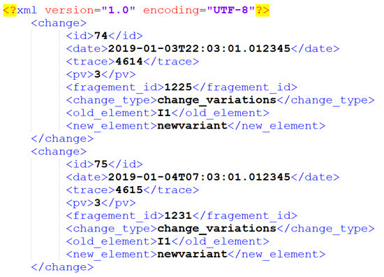 All these details are added to each change event, and for simplicity, we use an XML format to represent this information in an organized manner. Figure 3 provides an example of a sub-part of the obtained change log of variable fragments.