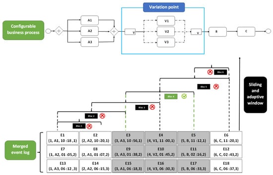 Since variable fragments are sub-parts of the configurable process, the appropriate type of window to use in this case is the adaptive window, which can adjust to the size of each variable fragment. Additionally, we need a sliding window to move through the events in the merged event log.