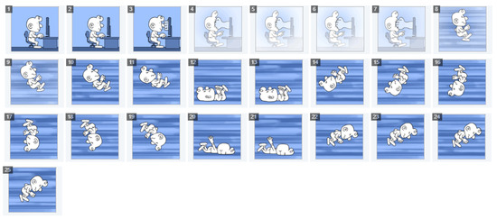 We set the maximum frame count to 20. In our approach to bullying detection, we considered the action represented in a GIF file. This action can be categorized as bullying or non-bulling. To analyze and determine the action type in each video, we used 20 consecutive frames, considering that most of our files have 30 frames/s. Therefore, twenty consecutive frames are analyzed in about 0.667 s. Here, a trade-off must be ensured between the number of frames explored by the algorithm and the total training time of the model. Using the empirical method of trial and error, we concluded that a value of 20 frames gives very good results, as we present in Section 4 as performance metrics. The training time was not extremely long. The more frames are analyzed from a GIF, the better the model will identify the action that is represented. Figure 4 shows a cyberbullying GIF decomposed into frames.