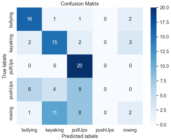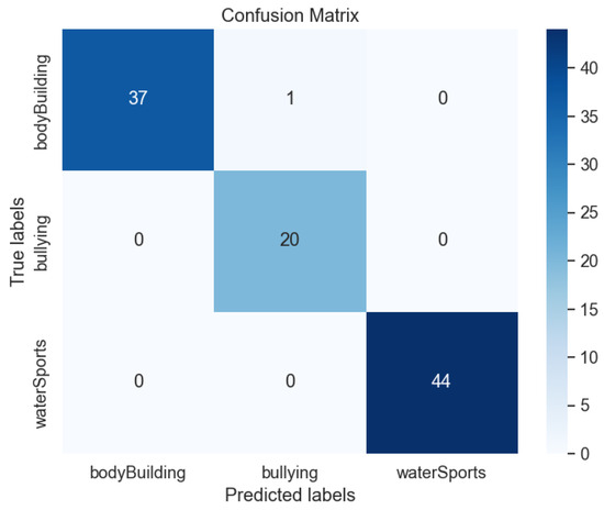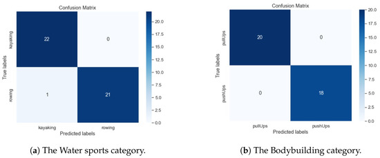 Figure 7a displays the confusion matrix for the Water sports category. We can observe that just one video was wrongly classified. It was of the Rowing type, but the system classified it as being Kayaking. Figure 7b displays the confusion matrix for the Bodybuilding category. We can observe that all of the videos were correctly classified.