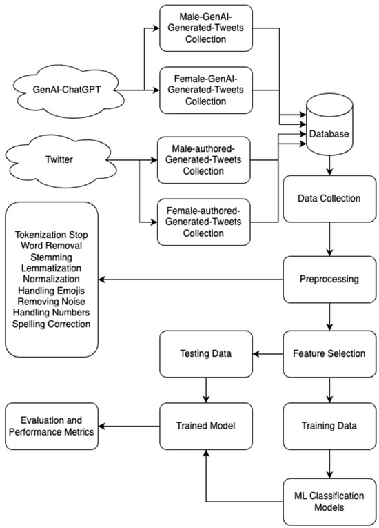 Secondly, we extended beyond historical datasets to encompass contemporary trends. In parallel with our exploration of older hashtags, we pivoted towards the latest trending hashtags on Twitter. This temporal approach enabled us to capture real-time conversations and emergent themes, thereby enriching the breadth and depth of our dataset. By correlating the datasets spanning distinct temporal epochs, we aimed to spot shifting patterns and trends in gender-specific, human-authored and gender-specific, GenAI-generated content. We have observed that GenAI now produced tweets with different contextual characteristics compared to those generated in the past. Therefore, similar to the initial phase, we acquired a dataset comprising tweets generated by real human users, alongside a corresponding dataset generated by GenAI for the same set of hashtags. Thus, two types of hashtags on Twitter were collected from two different sources at two different times to analyze the gender-specific behavior for both GenAI-generated tweets and human-generated tweets. The hashtags selected were not related to any specific topic but were randomly picked from the trending list at the time or those that showed up during our exploration. Subsequently, all tweets related to the chosen hashtags were collected and stored in a database. Concurrently, all hashtags from the collected tweets were extracted and inputted into the male and female sources of the GenAI application to produce tweets. This resulted in two types of tweets: those generated by real human users with two classes of gender and those generated by GenAI with two classes of gender, after being provided with the hashtags. The process unfolded through a systematic approach, encompassing various stages to ensure a comprehensive and balanced selection of data.