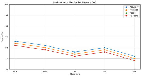 - Feature 500: When trained on a feature set consisting of 500 features, the MLP classifier demonstrates the highest performance across all metrics, achieving an accuracy of 83%. SVM follows with slightly lower scores of 81% accuracy. RF obtained 78%, DT scored 80%, and the NB classifier shows the lowest performance in this feature set with an accuracy of 76%.
