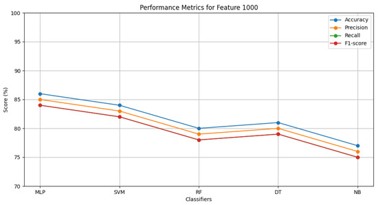 - Feature 1000: When trained on a feature set consisting of 1000 features, the MLP continues to outperform the other classifiers, achieving an accuracy of 86%. SVM shows strong performance as well, with a slightly lower accuracy score of 84%. RF obtained 80%, DT scored 81%, and NB showed improved performance compared to the 500-feature set, indicating that increasing the number of features enhances model performance, with an accuracy of 77%.