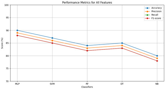 - All Features: When trained on a feature set consisting of all features, the MLP achieves the highest scores across all metrics, with an accuracy of an accuracy at 90%; this was followed by SVM at 87%, RF at 84%, and DT at 85%. NB, though improved, remains the lowest performer with an accuracy of 80%.