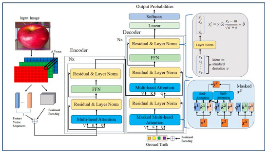 The decoder also consists of N layers, which were split into sub-layers. The first sub-layer utilizes masked multi-headed attention to ensure that the predictions for each position depend only on previous positions. The second sub-layer is an encoder–decoder multi-head attention, where the input comes from the encoder’s output and the decoder’s previous layer output. This layer facilitates information exchange between the encoder and decoder.