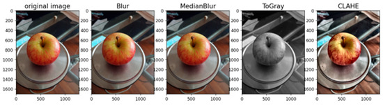 Furthermore, in the training process, we utilized some default hyperparameters of the framework, including an initial and final learning rate of 0.01. The framework offers a variety of optimizers, such as SGD (URL: https://github.com/CU-UQ/SGD, accessed on 4 August 2024), Adam, Adamax, AdamW, NAdam, RAdam, and RMSProp. For our experiments, we opted to allow the model to automatically select the most suitable optimizer. Moreover, in order to enhance the robustness of this proposed model, we utilized random data augmentation from the ultralytics framework during model training. Specifically, the data augmentation approaches include the random Affine transformation which involves translating, shearing, rotating, and scaling the image based on specified parameter values. In this transformation, we set the parameters as follows: degrees: 30.0, translate: 0.1, shear: 10, and scale: 0.5. Random 4-image mosaic augmentation combines four random images into a single mosaic image. HSV augmentation stands for hue, saturation, and value, collectively representing a color space used for describing colors. Figure 3 demonstrates the combined enhancement effect when we set the HSV parameters to hsv_h: 0.015, hsv_s: 0.7, and hsv_v: 0.4. We used the Albumentations toolkit to incorporate the techniques Blur, MedianBlur, ToGray, and CLAHE. Figure 4 showcases the effects of employing these augmentation techniques.