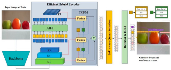 In this project, a DETR model named RT-DETR is employed for fruit detection and calorie estimation from digital images. RT-DETR [6] not only resolves the “two sets of thresholds” issue but also significantly improves practical utility, streamlining deployment processes. These advancements enable RT-DETR to meet real-time detection demands, leading to widespread adoption in practical applications. The architecture of RT-DETR is illustrated in Figure 5. In terms of structure, RT-DETR consists of three blocks: backbone network, neck network, and decoder.
