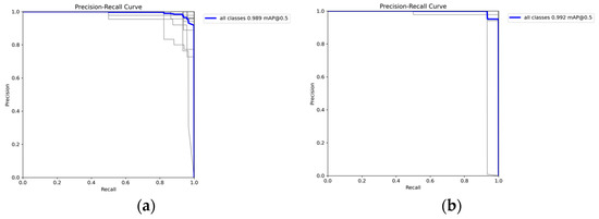 Figure 7a and Figure 7b illustrate the P-R curves for YOLOv10 and RT-DETR, respectively. We see that the curve of the RT-DETR model is higher than that of YOLOv10. Furthermore, the curve of the RT-DETR model is closer to the upper right corner compared to YOLOv10. In addition, the RT-DETR model has a higher AUC than YOLOv10, indicating that the RT-DETR model exhibits better performance.