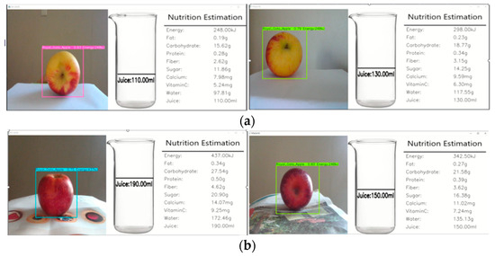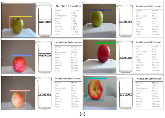 We created a dataset comprising 1866 images of various fruits for fruit detection. By using a camera, we captured videos of each fruit from multiple angles at equidistant distances and the images were obtained by extracting frames from the videos. The dataset consists of seven classes of local fruit products. To identify fruit categories and estimate their calorie content, each fruit was classified into weight categories of equal intervals, resulting in a total of 22 categories. For example, for Royal Gala Apples, weight categories were defined as follows: “Royal_Gala_Apple 1” for weights up to 140 g, “Royal_Gala_Apple 2” for weights between 140 g and 180 g, and “Royal_Gala_Apple 3” for weights exceeding 180 g.