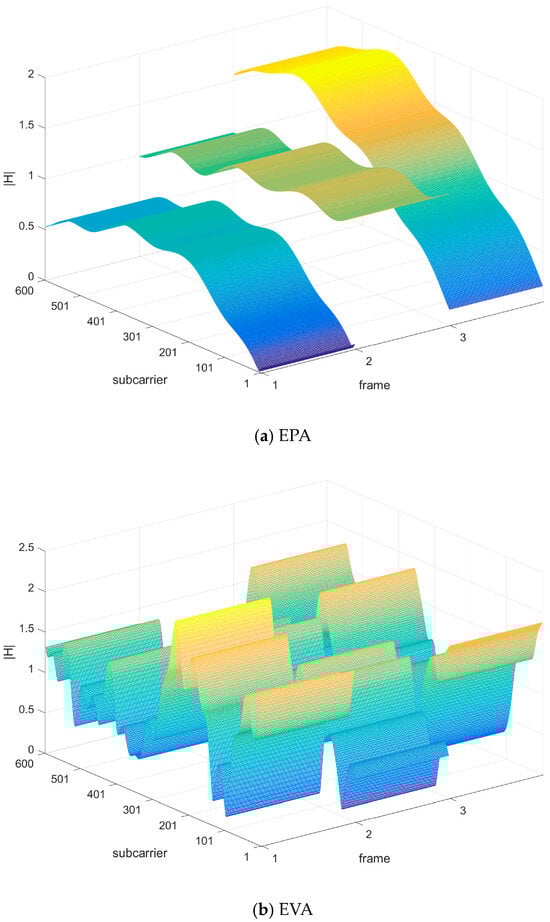 respectively. Recall that, following (4), we have and for the EPA channel. Using (15), we have = 0.237. With further calculations, we obtain variances approximately equal to 0.177 and 0.129 for the EVA and ETU channel models, respectively. According to (4) and (15), a channel with more evenly distributed power on each tap has smaller .