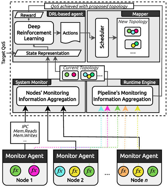 - We have designed a DRL agent capable of addressing different QoS requirements under varying levels of resource interference on a distributed, multi-tenant, heterogeneous cluster of virtual machines (VMs). The DRL agent dynamically adjusts the placement, migration, and scaling of serverless functions to regulate the workflow’s end-to-end latency, keeping it as close as possible to the user-defined QoS targets. By doing so, the agent minimizes resource waste, ensuring efficient utilization of computational resources while maintaining the desired performance levels.