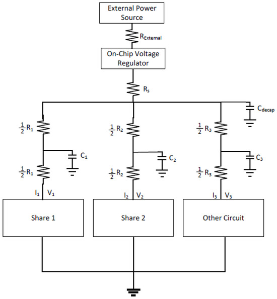 Simplified PDN model with masking shares and other circuitry where R is parasitic resistance, is decoupling capacitor, and C is the parasitic capacitance.
