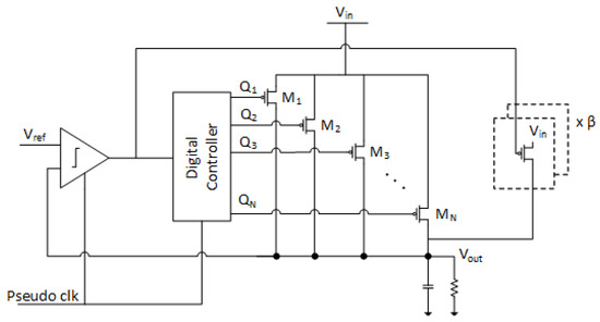 - Okuma, Y.; Ishida, K.; Ryu, Y.; Zhang, X.; Chen, P.H.; Watanabe, K.; Takamiya, M.; Sakurai, T. 0.5-V input digital LDO with 98.7% current efficiency and 2.7-μA quiescent current in 65nm CMOS. In Proceedings of the IEEE Custom Integrated Circuits Conference, San Jose, CA, USA, 19–22 September 2010; pp. 1–4. [Google Scholar]