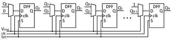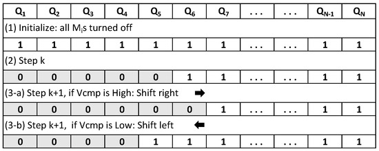 The schematic of the proposed Digital Low Dropout Regulator (DLDO) is shown in Figure 4. In this design, and serve as the inputs, while is the output. Figure 5 and Figure 6 detail the schematic and operational principles of the bi-directional shift register used in conventional DLDOs. The bi-directional shift register in this context includes a multiplexer and a D flip-flop (DFF) in each stage. The digital controller adjusts the value as depicted in Figure 6. The DLDO setup features N parallel PMOS transistors and a feedback control mechanism for output voltage regulation. In conventional DLDOs, a bi-directional shift register is employed. Here, denotes the ith PMOS transistor, and represents the output from the digital controller, with ith indicating the activation stage of the digital controller. The shift register toggles the state of one of the power transistors based on at each rising edge of the cycle. represents the Nth output signal of the digital controller as illustrated in Figure 4. During step , if is high, () is activated on (off) with the bi-directional shift register shifting to the right. Conversely, if is low, the shift register moves to the left as shown in Figure 6 [24]. Each is linked to , and due to the bi-directional activation scheme, the transistors through experience high usage. The limit cycle reduction technique from [25] is applied in a randomized behavior. This technique connects four parallel PMOS transistors to , randomizing limit cycle operations for more efficient, reliable, and secure voltage regulation.