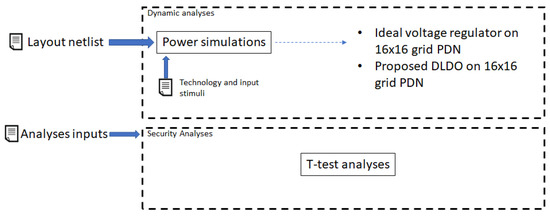 The proposed analysis framework consists of two stages: dynamic analyses and security analyses. The layout netlist contains the switching circuits with countermeasures and other circuits. The 32 nm PTM technology is used for the framework. We collect 100 k power traces with constant input and random input to the circuit, where the operation of the circuit is dependent on the variation in the input. We analyze a 16 × 16 resistive PDN with ideal voltage regulators and the proposed DLDO with Finesim. The TVLA method is utilized for the security analyses which contains the calculation of t-score, i.e., fixed vs. random t test. The flowchart of the proposed pre-silicon leakage detection framework is summarized in Figure 7.