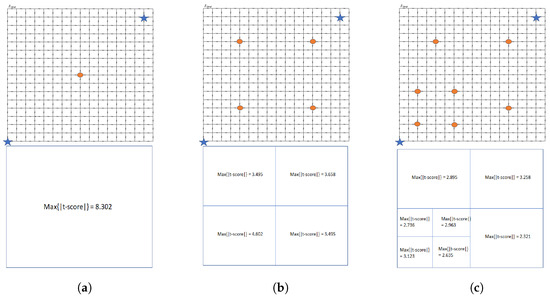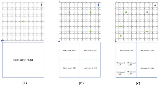 The proposed distribution of voltage regulators framework is applied to the second-order hardware masking. One of the hardware masking shares is located at the bottom left, and the other hardware masking share is located on the top right of the PDN as can be observed in Figure 8. The ideal voltage regulator is located at the center of the PDN, and the is 8.302, which is higher than the desired security level, i.e., 4.5. Therefore, the PDN is divided into quadrants. All the quadrants except the bottom left quadrant satisfy the security level defined in the t-test. The bottom left quadrant is also divided into quadrants. The seven ideal voltage regulators satisfy the required security level. The is reported in Figure 8, where the required security is satisfied in (c). The minimum is 2.321, and the maximum is 3.258.