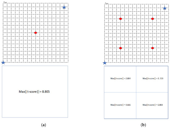 The t-test scores at the location of the proposed DLDO voltage regulators and first-order hardware masking with two shares. The voltage regulators are colored red with a circle, and hardware masking shares are colored blue with a star. (a) One proposed DLDO voltage regulator at the center and two hardware masking shares at the edges. (b) Four proposed DLDOs at the center of quadrants and two hardware masking shares at the edges.