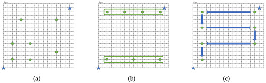 Seven conventional DLDOs are located according to different topologies. The conventional DLDO voltage regulators are colored green with a circle and hardware masking shares are colored blue with a star. (a) Seven conventional DLDOs at the center of the quadrants and two hardware masking shares at the edges of the power grid. (b) Seven conventional DLDOs according to the top–bottom topology. Two hardware masking shares at the edges of the power grid [27,28]. (c) Seven conventional DLDOs according to the daisy chain topology. Two hardware masking shares at the edges of the power grid [29].