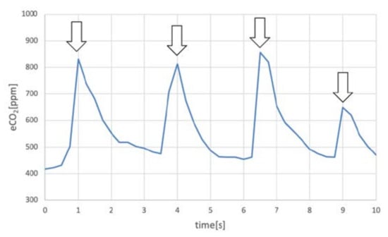 Measured waveforms of the wearable MOx sensor, showing the eCO2 concentration peaks (indicated by the arrows).