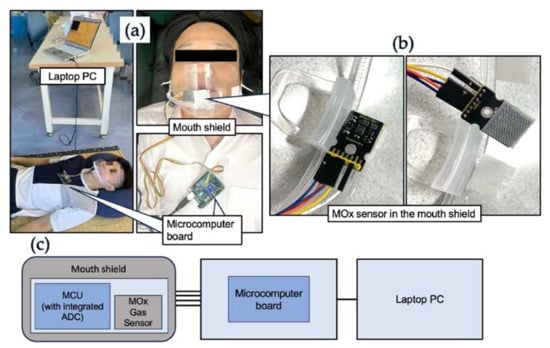 Experimental environment: (a) physical setup overview, (b) attachment of the wearable MOx sensor in the mouth shield, and (c) equipment configuration diagram.