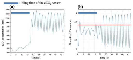 Experimental results at rest: (a) eCO2 concentrations and (b) normalized filter output, where the idling time of the eCO2 sensor is indicated with the blue bar.