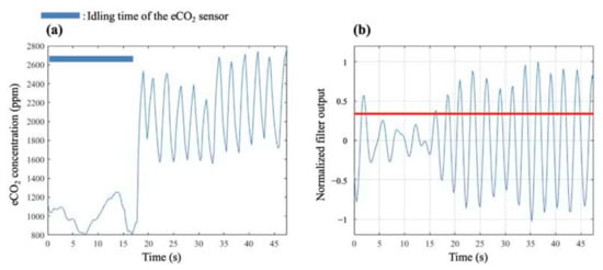 Experimental results of time waveforms for eCO2 concentration during body movement: (a) eCO2 concentrations and (b) normalized filter output.