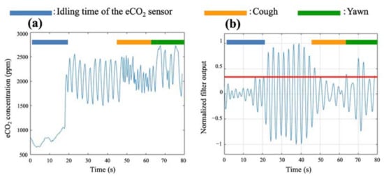 Figure 8b shows the time waveform after applying a bandpass filter to the measured eCO2 concentration data during coughing and yawning. Since the eCO2 changes caused by coughing and yawning had frequencies close to respiration, the bandpass filters used in this experiment did not adequately eliminate these changes. In the filter output shown in Figure 8b, a peak value of at least 0.369 is present in the measured waveform of the eCO2 due to deletion detected at around 70 s, which resulted in a false single breath detection. This suggests that depending on the type of yawn, a temporal waveform of yawning may occur that has components similar to the frequency characteristics of breathing.
