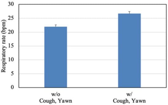 Finally, Table 3 and Figure 9 show the means and standard deviations of the estimated respiratory rate with and without coughing and yawning conditions. The results show that coughing and yawning are influenced by the estimated accuracy of the breathing rate. The estimated mean breathing rate was 26.72 bpm, with an absolute error of 4.22 bpm compared to the reference value of 22.5 bpm.