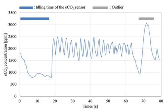 Figure 10 shows an example of the eCO2 measurement data at the rest state, where not only normal respiration but also outlier respiration was observed. The data were pre-processed for the removal of the DC component, interpolation on the time domain, and short-time Fourier transform (STFT). The STFT was used to analyze the time variation of the frequency components in the measured eCO2 concentration.