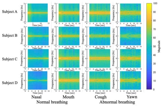 Figure 11 shows examples of the STFT for the measured data, where we can see that nasal breathing had a certain, narrower frequency component that was stronger and had less temporal variation. Mouth breathing had a wider frequency range than the nasal breathing, but the temporal variation was as small as the nasal breathing. On the other hand, abnormal breathing, depicted as coughs and yawns, had patterns that were characterized by a wider frequency range compared to normal breathing, while also having greater temporal variation.
