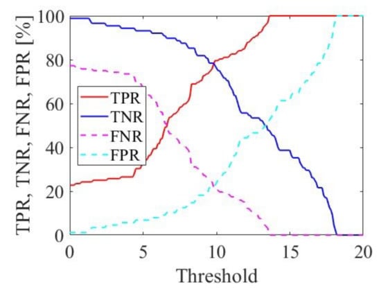 Figure 12 shows the changes in the estimation accuracy with respect to the threshold value . All four evaluation metrices were sensitive to the threshold setting, so we should further optimize the threshold to achieve better performance. Additionally, Table 4 shows the confusion matrix when the threshold value was optimized for the TPR and TNR criteria. From these results, it can be confirmed that one-class SVM-based classification achieved a TNR and TPR of approximately 80% by appropriately selecting the threshold value.