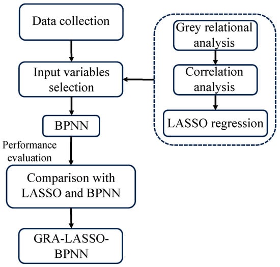 This section describes the architecture of the GRA-LASSO-BPNN hybrid prediction model and the methods used for data collection. It examines the GRA method, which identifies key drivers of residential costs; the LASSO method, which further refines input variables through regularization; and the BPNN, which possesses strong learning capabilities and robustness. The establishment process of the GRA-LASSO-BPNN hybrid prediction model is shown in Figure 1.