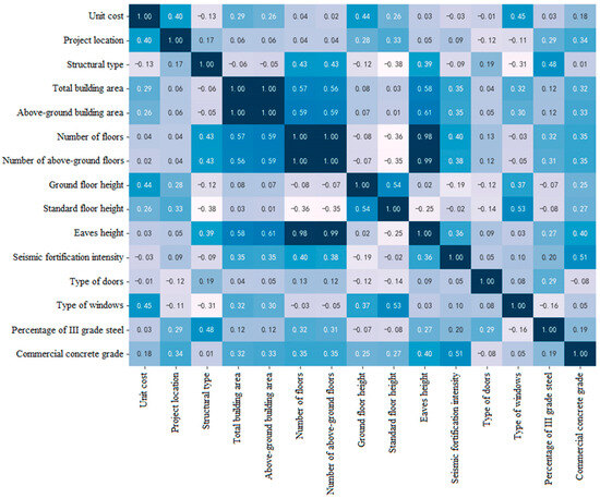 In this study, using the GRA, 17 input variables such as ‘project location’ and ‘structural type’ from 47 engineering projects were used as comparative sequences, and ‘unit cost’ was used as the system’s reference sequence for the grey relational analysis. The grey relational degrees between each input variable and the unit cost were calculated and sorted in descending order, resulting in the grey relational analysis outcomes shown in Table 2.