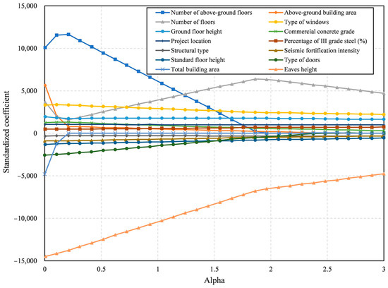 The importance of the input variables affecting the unit cost of residential projects was ranked using GRA. Through a preliminary screening based on threshold values, three variables with less impact—the underground building area, number of underground floors, and presence of a basement—were filtered out. However, the further selection of input variables required regularization through LASSO regression. After LASSO regularization, the input variables were reduced to 14, as shown in Figure 7.
