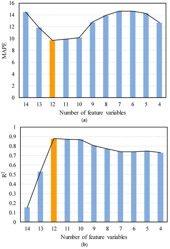 Figure 6 shows the fluctuations of these indicators in the GRA-LASSO model with the number of feature variables. According to the results, the model with 12 feature variables is considered the optimal model. This model has the lowest MAPE and the highest R2, while also meeting the requirement of the unbiased model with Mallows’ CP index close to the number of feature variables + 1, indicating low bias in the model. At this point, combining the GRA-LASSO variable selection where the regression coefficients of the number of above-ground floors and the total building area were first compressed to zero, the remaining 12 variables are determined as the input features for the BPNN model.