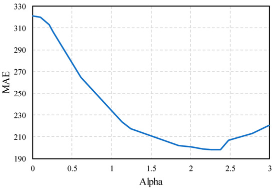 Although some variable coefficients may initially show an upward trend, the overall trend is that the variable coefficients approach zero. As the regularization intensity increases, less influential variables are eventually eliminated, retaining only important variables. The model increasingly tends towards a simpler form during this process. However, a simpler model is not always better. As shown in Figure 7, the Mean Absolute Error (MAE) of the regression prediction model initially decreases and then increases as Alpha gradually increases. Therefore, selecting an appropriate Alpha value in practical applications is necessary to achieve a GRA-LASSO prediction model with better performance parameters.