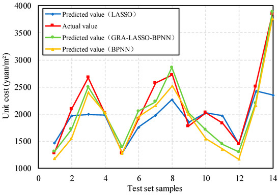 To verify the performance of the GRA-LASSO-BPNN prediction model proposed in this paper, its prediction results were compared with those obtained using the BPNN and LASSO regression methods alone, as well as with the actual unit costs. The LASSO regression model is specifically shown in Equation (13). The BPNN method and its specific parameters are detailed in Section 3.3.