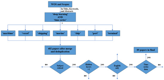 After undergoing keyword filtering and manual screening, we retained 89 papers that utilize deep learning architectures and are based on time series data for predictions within the maritime domain.