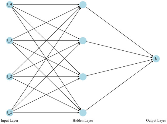 The ANN forms a type of machine learning model that is structured to reflect the human brain’s neural configuration, which is noted for its effective performance [9]. Structurally, a traditional ANN consists of three key layers: the input layer, one or more hidden layers, and the output layer [10]. In this setup, raw data are first gathered in the input layer and then processed through the hidden layers where patterns and features are extracted. The processed information is finally sent to the output layer, which generates the predictive outcomes. The normalization of input and output data, typically within a range of 0 to 1 or −1 to 1, ensures stability and efficiency during training by preventing numerical issues and enhancing convergence rates. The foundational architecture of the ANN shown in Figure 2 consists of three layers: an input layer comprising four neurons (I_1 to I_4), a hidden layer containing four neurons, and an output layer featuring a single neuron (E). Each neuron is interconnected through weights optimized during training, allowing the network to perform tasks such as prediction and classification effectively.