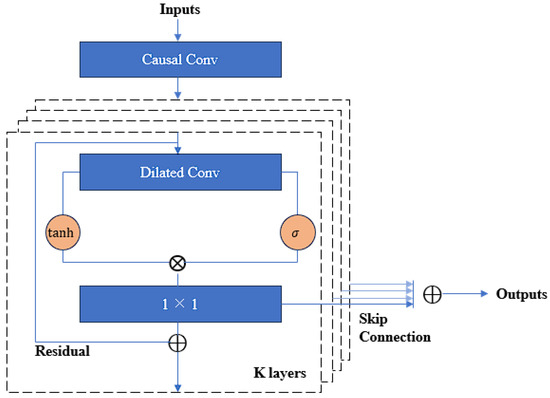 Recent advancements in ANN research have led to the development of high-performance models, notably the WaveNet, a generative model based on convolutional neural networks designed for audio waveform generation [17]. This model incorporates several advanced deep learning technologies, including dilated causal convolutions, residual modules, and gated activation units. The hallmark of WaveNet is its dilated convolution structure, which enables the model to effectively learn long-term dependencies within audio data, demonstrating robust learning capabilities. As a probabilistic autoregressive model, WaveNet directly learns the mappings between sequential sample values, revealing its potential across a variety of application scenarios. Figure 3 illustrates the foundational architecture of WaveNet. Furthermore, for a sequence of , its joint probability can be represented by Equation (2). WaveNet also utilizes gated activation units, whose mathematical expression is depicted in Equation (3).