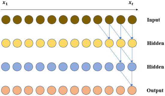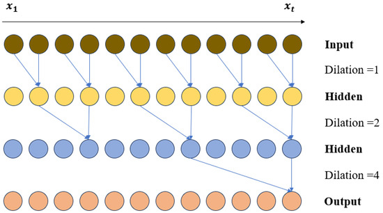where represents the time step index within the sequence; denotes the total length of the sequence; and indicates the layer index. The terms and refer to the filter and gate, respectively, while is a learnable convolution filter. A fundamental component of WaveNet is its use of causal convolutions. By employing causal convolutions, the model ensures that the temporal order of data is preserved during modeling. WaveNet enhances this approach by incorporating dilated causal convolutions. Dilated convolutions skip input values at specified intervals, allowing the convolutional kernel to cover a larger area than its actual size, which improves model performance. Figure 4 and Figure 5 illustrate causal and dilated causal convolutions, respectively. The key difference in the hidden layers is that the dilated layers in Figure 5 use different dilation rates to skip inputs. This allows the model to cover a broader range of data without increasing the number of parameters. In contrast, the hidden layers in Figure 4 process consecutive input data points, focusing on immediate information. This dilation in Figure 5 helps the model capture longer-term dependencies in the data. WaveNet has been demonstrated to be effective in synthesizing natural human speech and predicting time series [18,19].