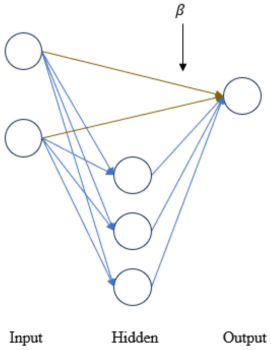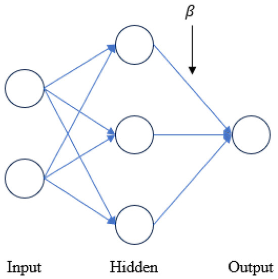 ELM represents a type of random neural network, particularly emphasizing the use of a single hidden layer, where the weights and biases of the hidden layer remain fixed after initialization. Within the ELM framework, the only parameters that need optimization are the output weights, which are the weights connecting the hidden nodes to the output nodes. These are typically computed efficiently via matrix inversion operations. Figure 6 illustrates a simplified ELM architecture, and represents the weights associated with the connections in the network.