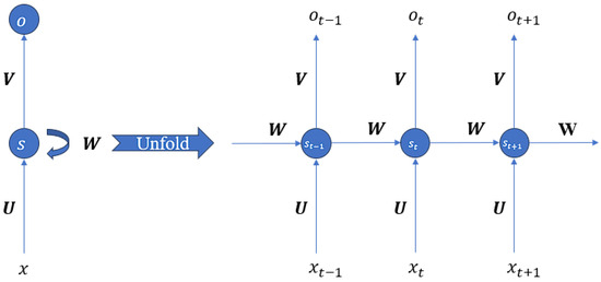 represents the input layer; s denotes the state of the hidden layer; , , and signify the weights; and o stands for the output layer. “Unfold” typically refers to expanding the RNN across the time series into a sequence of feedforward networks. The RNN, with its unique memory capacity and flexibility, demonstrates a decisive advantage in the field of series forecasting [45]. Whether it is predicting traffic flow, forecasting financial and stock market trends, or anticipating weather and climate changes, RNN plays a crucial role in producing accurate predictions [46,47]. The basic equations for the RNN can be represented by Equations (7) and (8).
