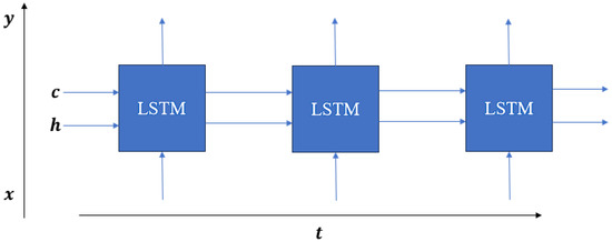 represents the hidden state, while denotes the long-term memory cell. The connection between and is finely controlled by three “gates”: the input gate, the forget gate, and the output gate. In each consecutive time step, the LSTM utilizes the current input and previous state to determine the extent of memory elimination (through the forget gate), the quantity of new information to assimilate into the memory cell (through the input gate), and the amount of information transmission from the memory cell to the current hidden state (through the output gate). These gates primarily manage the flow of information, utilizing sigmoid and tanh activation functions. When error signals are relayed from the output layer, the LSTM’s memory cell ccc captures vital error gradients, facilitating prolonged information retention. Compared to RNN, LSTM alleviates the problems of vanishing or exploding gradients to some extent through their gating mechanism, thereby more effectively handling long-term dependencies. The internal details of the LSTM are shown in Figure 12 and Equations (9) through (14) illustrate all the internal components of the LSTM.