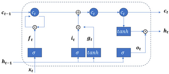 The LSTM network, proposed by Hochreiter and Schmidhuber [50,51], was developed to overcome the limitations of short-term memory in the traditional RNN [52]. It features a unique memory cell and an advanced gating mechanism within the RNN framework to enhance functionality. This mechanism includes three key components: an input gate, a forget gate, and an output gate. Together, they regulate the retention, maintenance duration, and retrieval timing of information in the memory cell [53]. Figure 11 illustrates the fundamental structure of the LSTM.