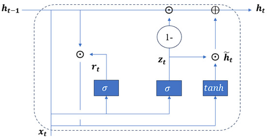 where and represent the candidate vector and output vector, respectively; denotes an activation function; refers to the weight matrices associated with the inputs to the network’s activation functions; is identified as the update gate; and represents the reset gate.